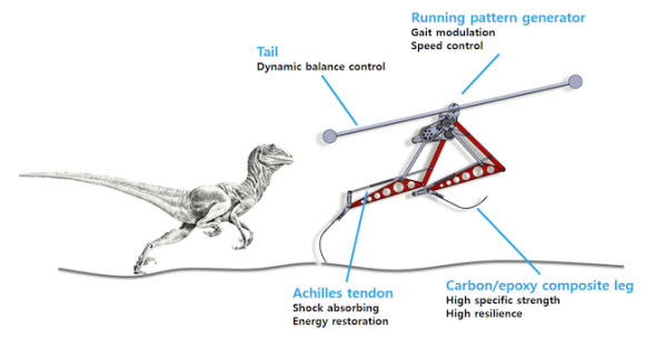 But Raptor is lighter, weighing just under 7 pounds. Its tough carbon fiber legs are designed with Achilles tendons, which act as shock absorbers. The robotic raptor also has a “tail,” a pole affixed to the robot’s side. It looks nothing like a dinosaur’s tail, but its function is the same, said Jongwon Park, one of the PhD students at KAIST. The tail acts as a counterweight, stabilizing the machine even as researchers throw styrofoam blocks in its path.